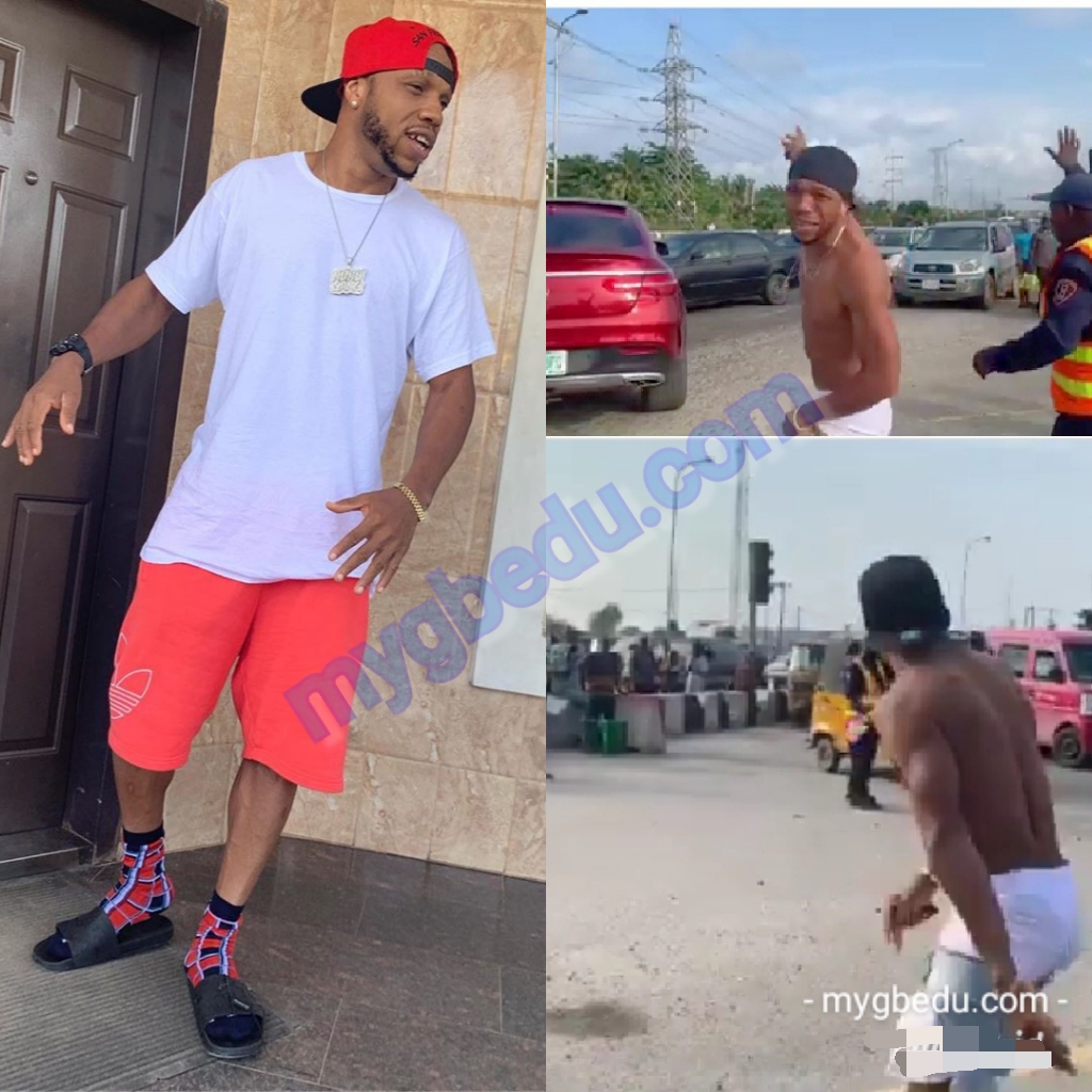 The actor is known for his insane skits and crazy acts, this time he took it to another level as he almost pushed some LASTMA officer to the ground. He went as far as creating traffic, because motorist and others could not help but wait for the actor to be done with his crazy act.